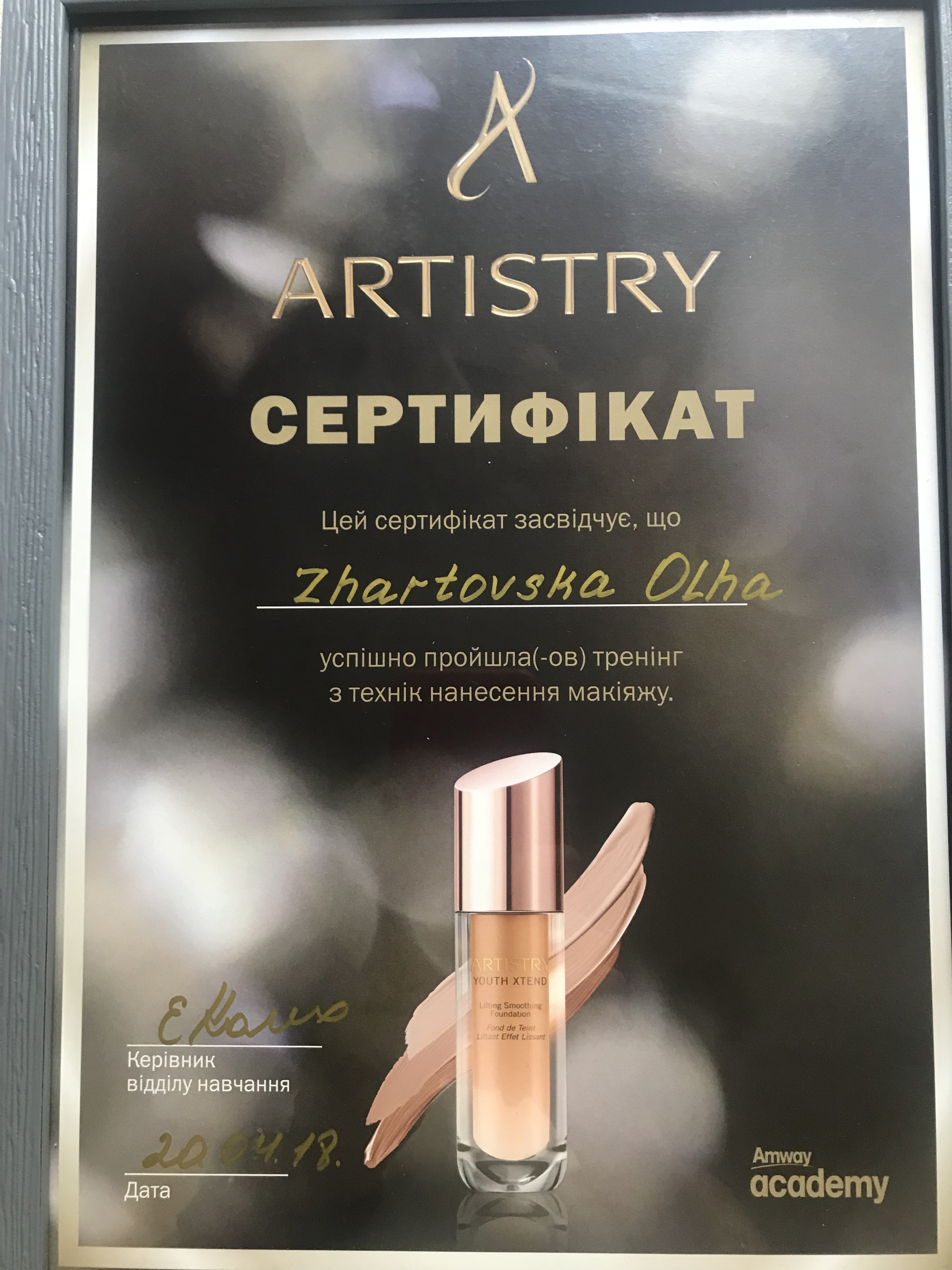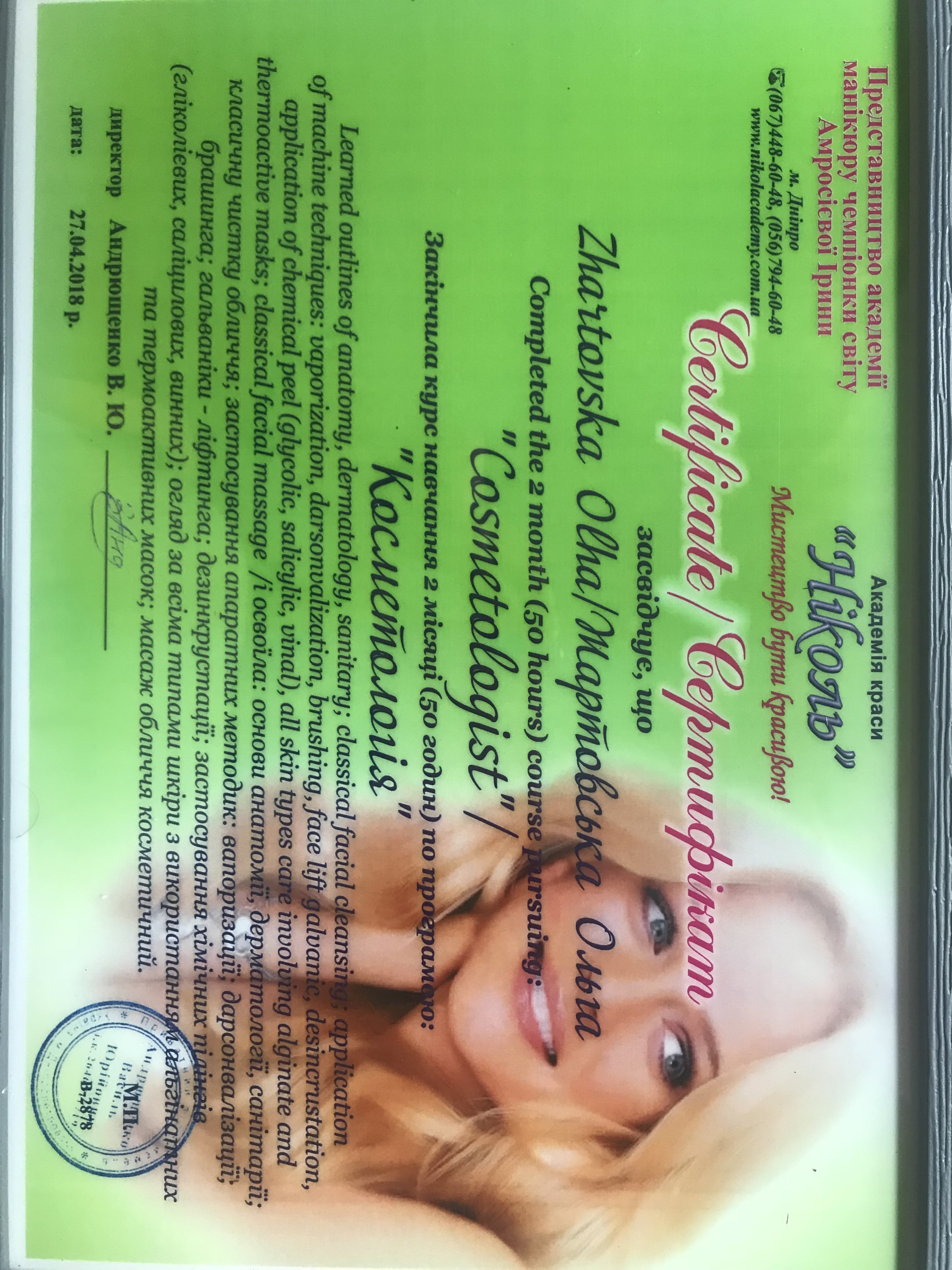 С 2014 года обучалась 2,5 года в Киевской академии красоты и здоровья. Там же Курсы визажистов. В Днепре вела проект Lady See Lady Do, где обучала девочек, девушек, женщин подбирать себе декоративную косметику и делать себе макияж. Но любая Красота начинается с качественного ухода за кожей и правильного питания. Прошла Курсы нутрициологии, посетила десятки лекций. Обучение косметологии в Днепре в академии Николь (50 часов практики). Диплом о работе с аппаратом Demadinic (made in Korea). Работаю исключительно с американской косметикой премиум-класса Artistry, подбираю саплименты лучшего производителя Органического Nutrilite (N1 в мире), индивидуально по потребностям. Веду страничку в Istagramm @lady.see.lady.do, информационную, специализируюсь на бьюти-мифах.
